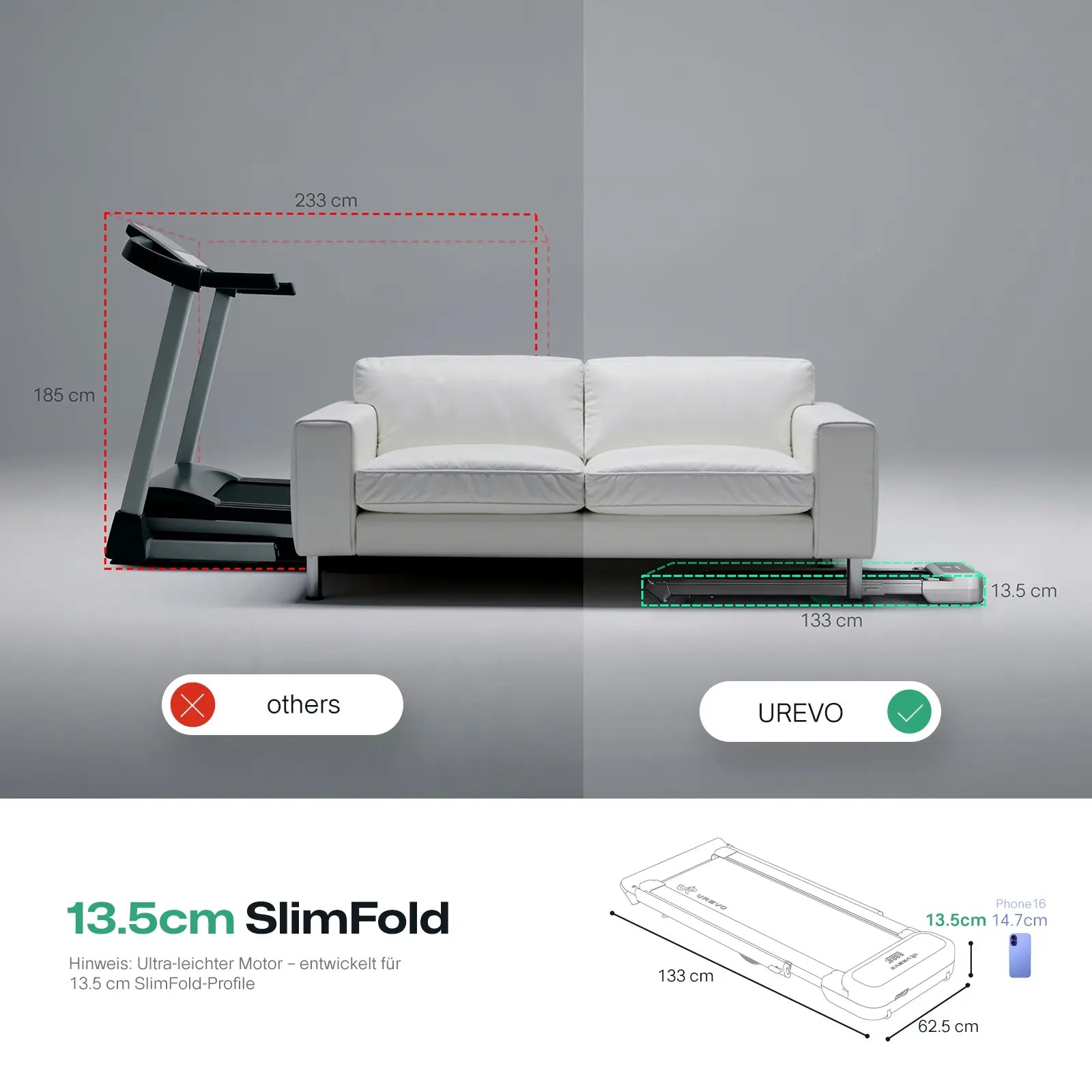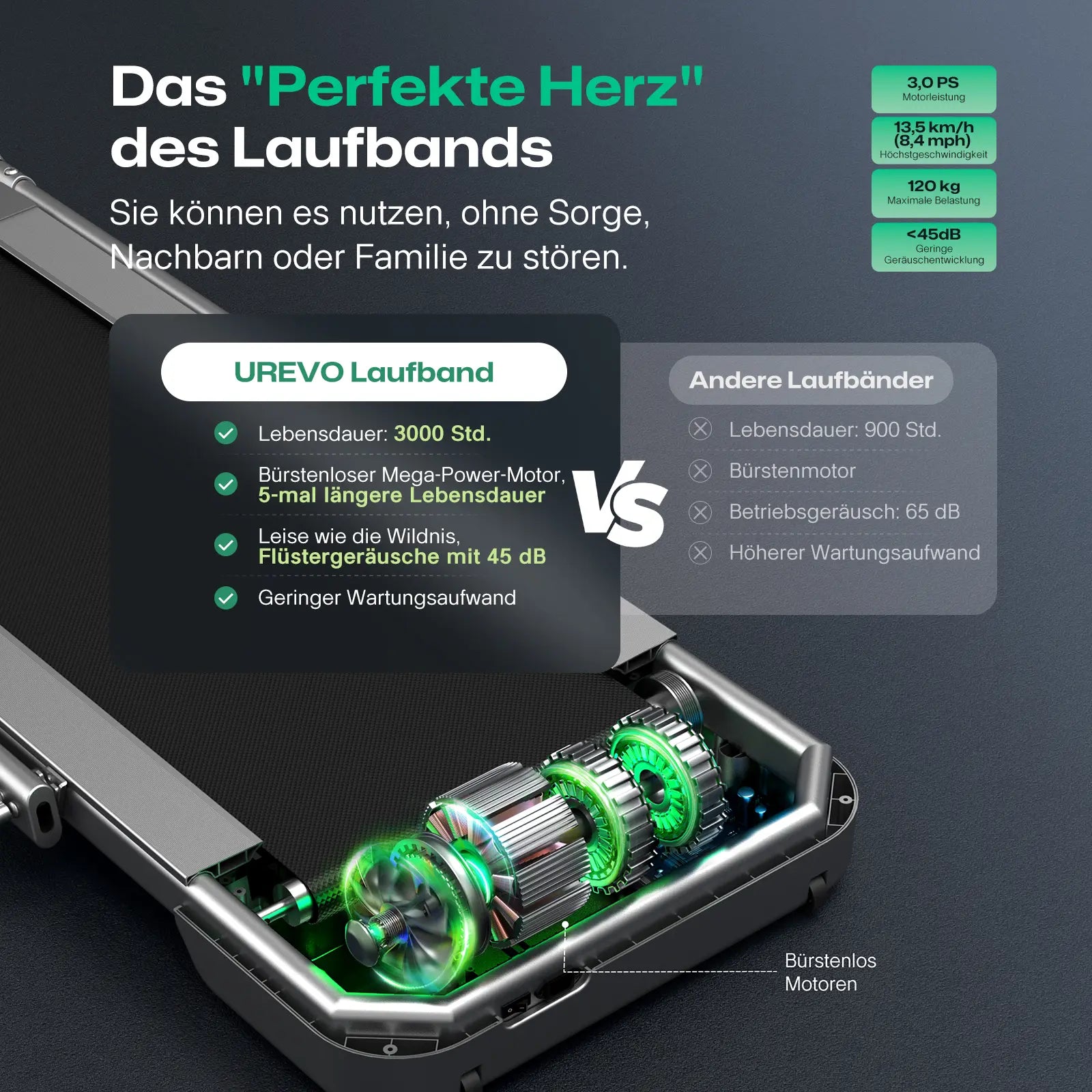 - Borstlös motor för varje hemmagym: Vårt system med dubbla motorer levererar äkta 3,0 hk (3,0 hk) kraft i kommersiell kvalitet - dubbelt så kraftfull som vanlig hemutrustning. Omfattande UREVO-laboratorietester garanterar tyst drift på 45dB som inte stör rumskamrater eller grannar.