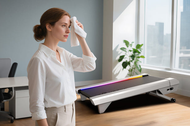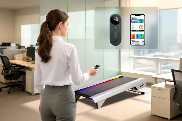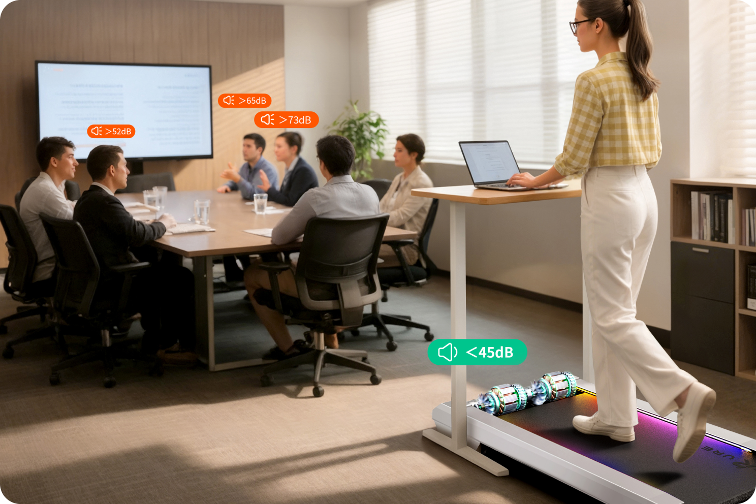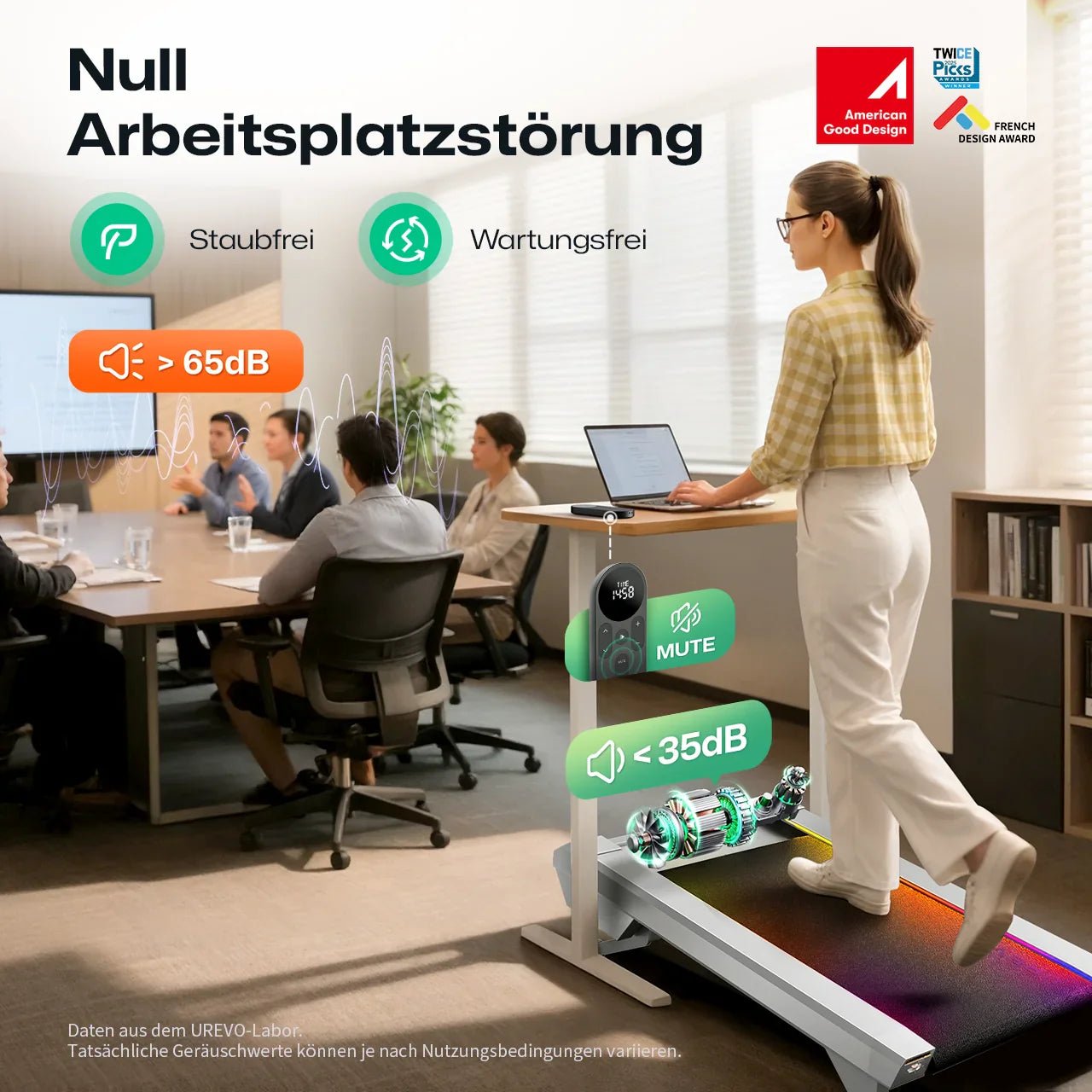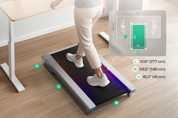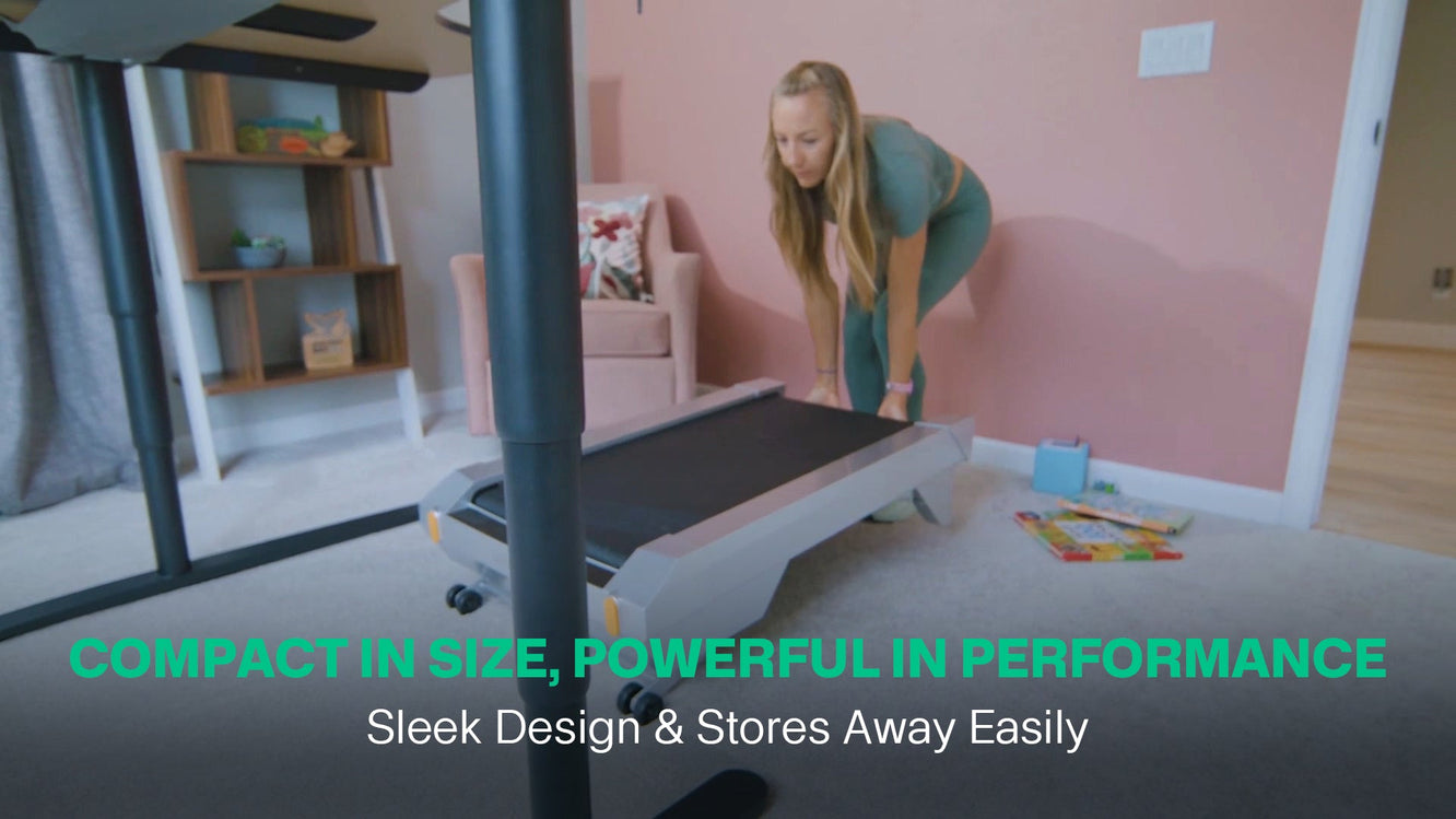 Passar under 90 % av alla skrivbord - arbeta och gå synkront: Inga fler klumpiga löpband! Vår smala 6,4-tums (16,3 cm) profil glider lätt under 90 % av kontorsborden - även med låg markfrigång. Ingen irriterande omställning, inga snubbelrisker – bara ett utrymmesbesparande träningspass medan du arbetar.