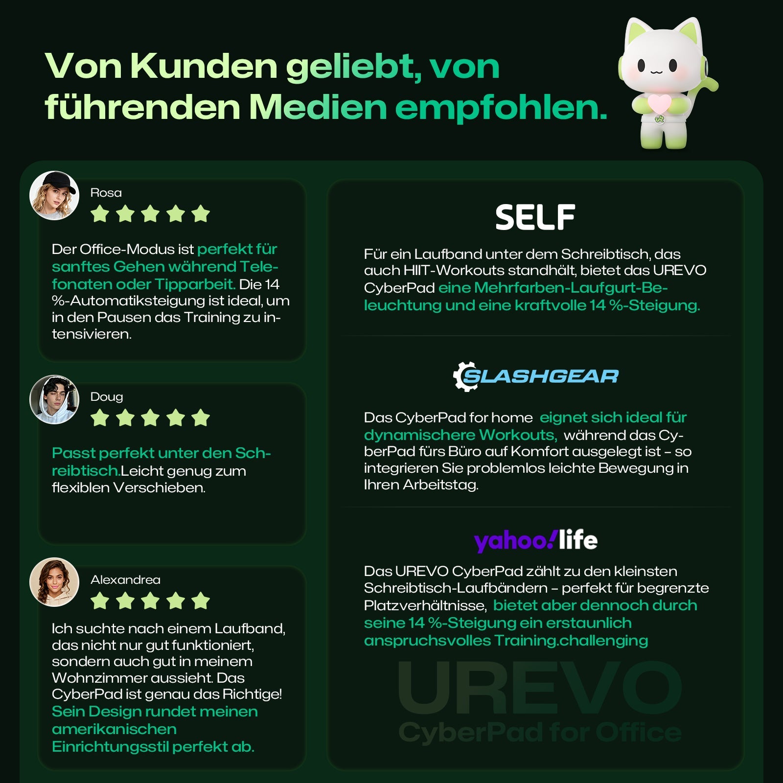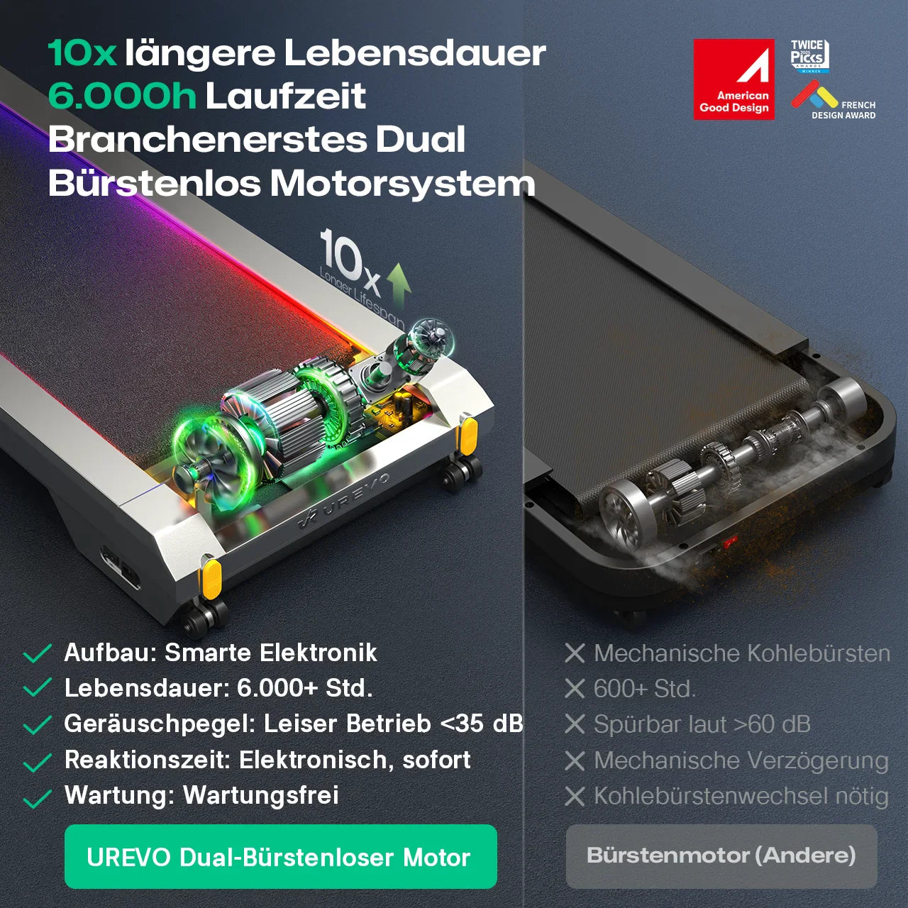 10x längre livslängd, viskande tyst: Med ett dubbelt borstlöst motorsystem erbjuder denna gångplatta verklig professionell prestanda (2,5 hk) - dubbelt så mycket effekt som vanliga hemenheter. Tack vare UREVOs laboratorietester uppnår vi viskningstysta 35 dB - ingen störande faktor för rumskamrater eller grannar.