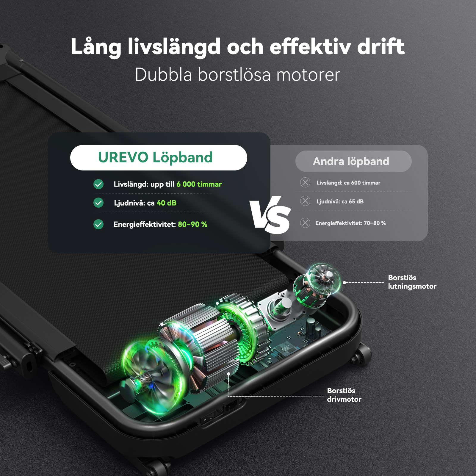 Dubbel borstlös motor: Dubbla borstlösa MegaPower-motorer på 3,0 hk med hög prestanda. Mycket tyst, dammfri och hållbar konstruktion. Miljövänlig design som ger stabil och kontinuerlig drivkraft under hela träningspasset.