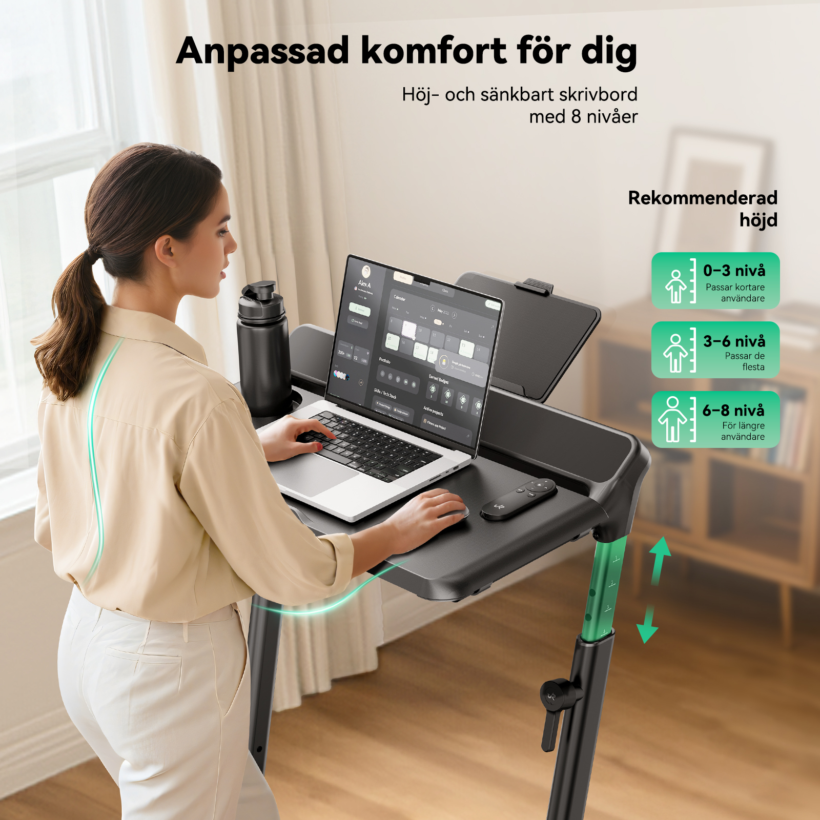 Kraftfull arbetsstation: Höj- och sänkbart multifunktionellt skrivbord med ett pålitligt stödsystem som ger en stabil och bekymmersfri träningsupplevelse.