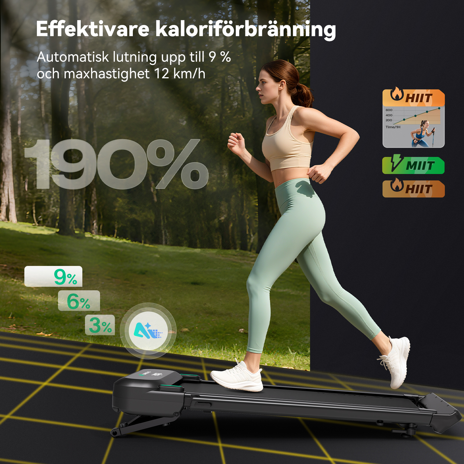 Ditt eget hemmagym: Löpbandet har 9 olika nivåer och upp till 9% automatisk lutning. Bandet tål en belastning på 181kg.